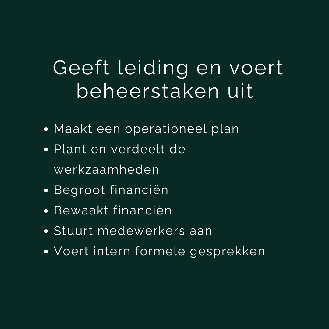Als Leidinggevende Keuken weet je wat er op de werkvloer gedaan moet worden. Je hebt een coördinerende, aansturende, regelende, controlerende en signalerende rol. Je bent de schakel tussen een bedrijfsleiding. Je bent verantwoordelijk eind verantwoordelijk voor de bedrijfsvoering in de keuken.